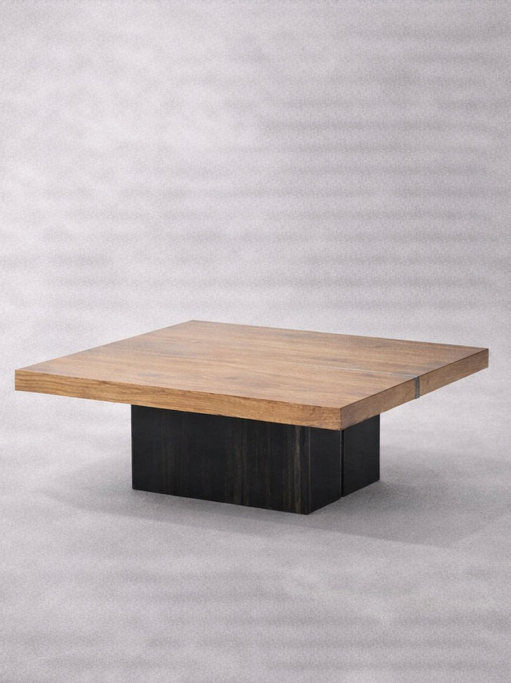 Sobre de madera natural, con vetas visibles y acabado cálido, aporta carácter y elegancia al espacio. La pieza se apoya sobre una base central de chapa lacada en negro, de diseño geométrico, que genera un contraste moderno y aporta estabilidad visual al conjunto.